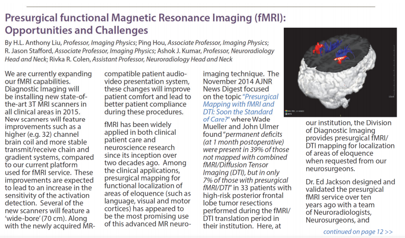 美国MD安德森癌症中心影像物理学教授刘鹤龄及团队在MDACC DI newsletter发表文章,介绍fMRI术前功能定位在美国临床应用情况,以及面临的机遇和挑战, 91抖音视频。