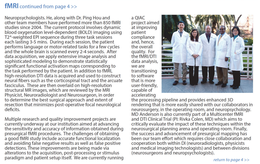 MD安德森癌症中心正在进行多个研究和质量改进项目,旨在提高术前fMRI信息获得的灵敏度和准确性,获得一个好的fMRI研究成果面临的挑战包括:准确的功能定位和避免假阴性\假阳性检测结果,这些改进可以通过改变数据采集方式,后处理或刺激模式以及患者本身实现,我们正在进行一个QIAC项目,旨在通过提高患者参与度来提高整体的质量,对于fMRI/DTI数据分析,我们将开发出更加人性化,能够加速处理通道和提供增强3D渲染效果的软件,从而更方便地与合作者共享,包括神经外科,手术室以及神经心理学专家,MD 安德森癌症中心也是目前fMRI和DTI多功能临床试验中心的一份子(PI: Rivka Colen, MD) 91抖音短视频APP,旨在评估这些技术对神经外科领域和手术室的影响,最后,准确和高效的术前定位一直是我们团队的努力方向,这不仅需要内部通力合作(包括与神经放射学家,物理学家,医学成像技术人员的合作),还需要跨部门密切合作(与神经外科医生和神经心理学家合作), 。