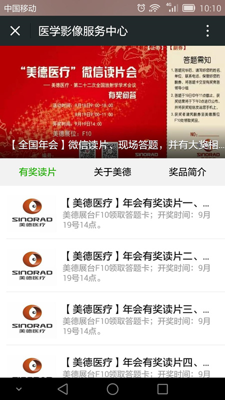 同时,美德医疗与微信公众平台“医学影像服务中心”合作,推出微信有奖读片活动,线上线下同步进行,按照分系统读片模式,分别为中枢,头颈部,腹部,盆腔及骨肌各一例,现场发出答题卡300张,最终获奖人数为30人 91抖音免费观看, 。